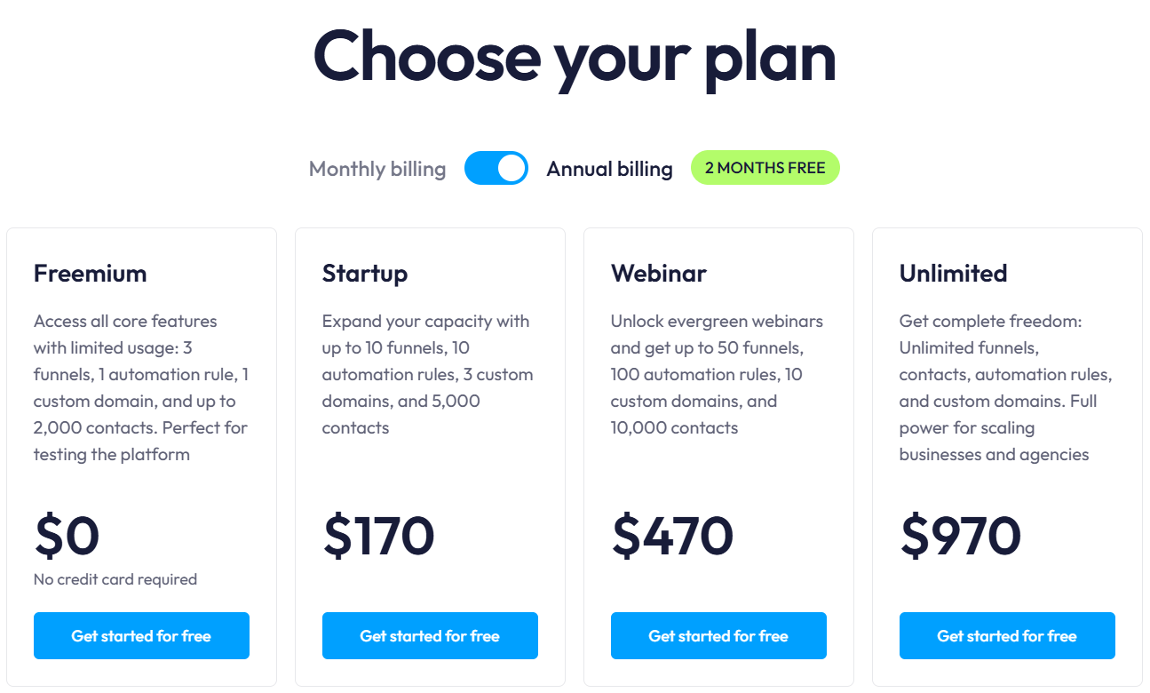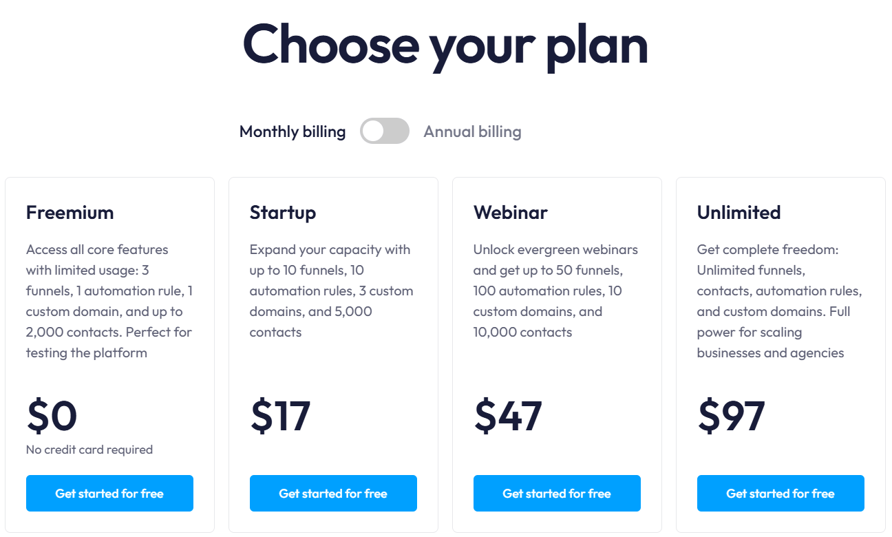Systeme.io currently offers four different monthly plans to choose from: the Freemium plan, the Startup plan, the Webinar plan, and the Unlimited plan.
